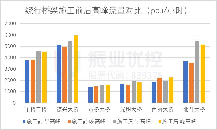 從數(shù)據(jù)觀察得知6座橋梁高峰通勤車(chē)流量均有所上升,其中市橋三橋早、晚高峰,德興大橋晚高峰及北斗大橋早、晚高峰,流量漲幅明顯,特別是北斗大橋,成為沙灣大橋封閉后連結(jié)南沙及番禺的主要通道,車(chē)流增幅明顯,達(dá)到45%,工程師根據(jù)流量變化情況對(duì)預(yù)設(shè)方案進(jìn)行實(shí)時(shí)調(diào)整。