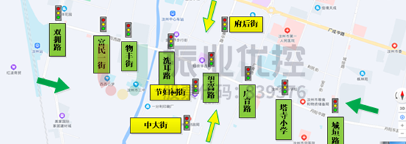 老城區(qū)受限于道路條件,車輛通行能力不足,因此采用綠波協(xié)調(diào)控制就是一種比較好的方法。綠波協(xié)調(diào)可以根據(jù)需要,快速清空城區(qū)車輛,減緩外圍車流駛?cè)耄行Ь饴肪W(wǎng)流量。本案例通過在老城區(qū)設(shè)置十字綠波,初步實現(xiàn)區(qū)域綠波效果,有效提升區(qū)域內(nèi)車輛通行效率,緩解區(qū)域擁堵問題。