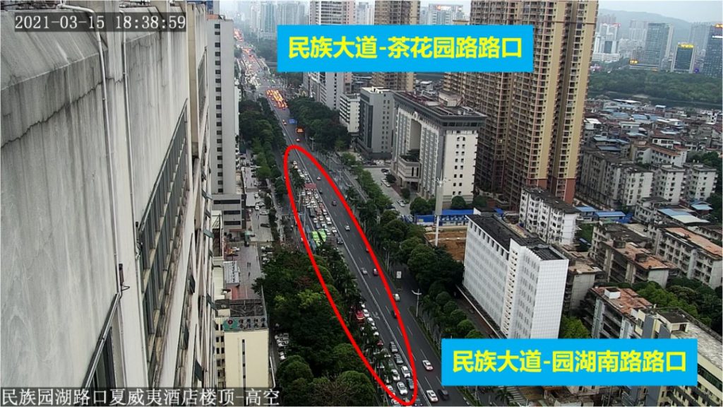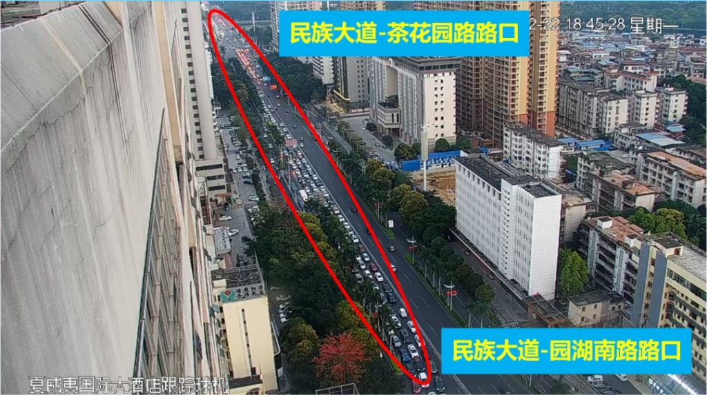 技術團隊在充分挖掘現(xiàn)有道路的時空資源基礎上,在安吉大道、民族大道等路段,創(chuàng)新應用“集裝箱式”綜合協(xié)調控制方案,利用綠波協(xié)調+紅波截流的組合方式,有效解決飽和流量路段車流擁堵回溢問題。