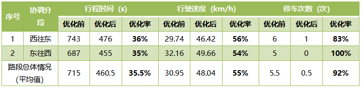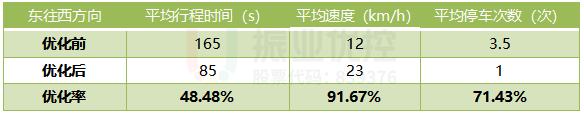 優(yōu)化后,早高峰東往西方向行程時間1分25秒,較優(yōu)化前節(jié)省行程時間約1分20秒,停車次數(shù)由3次降為1次,路口回溢風險消除。