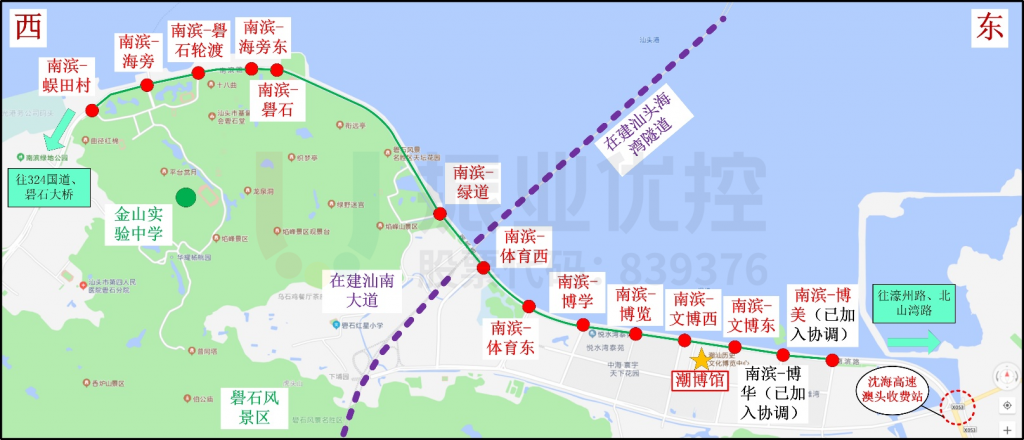 南濱路是貫通整個南濱新城東西方向的主要通道,西接礐石大道、324國道等快速路,東至濠州路、北山灣路,全長6.87km。西段(南濱綠路路口以西)為雙向六車道,東段(南濱綠路路口以東)為雙向四車道,是汕頭濠江區(qū)對外聯(lián)系的重要道路。