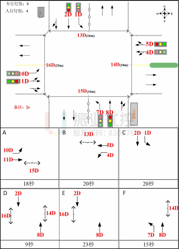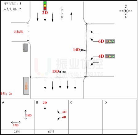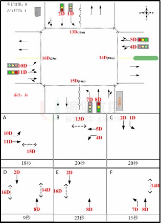 經(jīng)排查,該路口硬件設備不適用“早切斷、遲啟動”的優(yōu)化手段,遂對該路口采用相位搭接的方法進行優(yōu)化(優(yōu)化后B相位),避免東進口左轉(zhuǎn)尾車車流與南進口行人沖突。