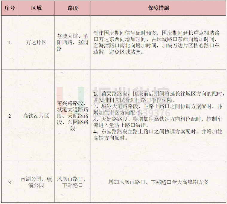 針對荔城大道、荔園路、東園路、東圳路、莆陽路、八二一大街、城港大道、學園路、勝利路、延壽路、天妃路等主干道,萬達片區(qū)、高鐵站片區(qū)、南湖公園綬溪公園等商圈和景區(qū)周邊,實施信號配時優(yōu)化預(yù)案,通過調(diào)整相位配時配合路面執(zhí)勤警力疏堵的措施,確保重點路口、路段、區(qū)域避免出現(xiàn)大規(guī)模擁堵,保證車流正常通行。