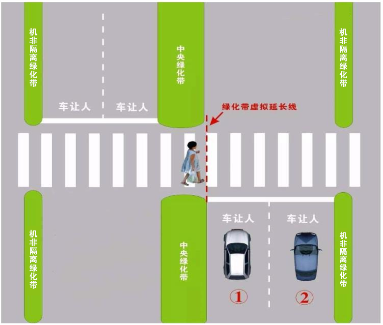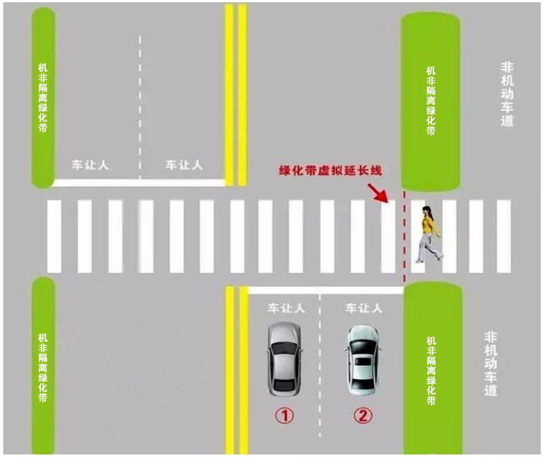 當(dāng)行人未經(jīng)過“綠化帶虛擬延長線”位置,車道①車輛可通行,車道②車輛應(yīng)該讓行。如果行人跨過“綠化帶虛擬延長線”位置,車道①、②車輛都應(yīng)該避讓。