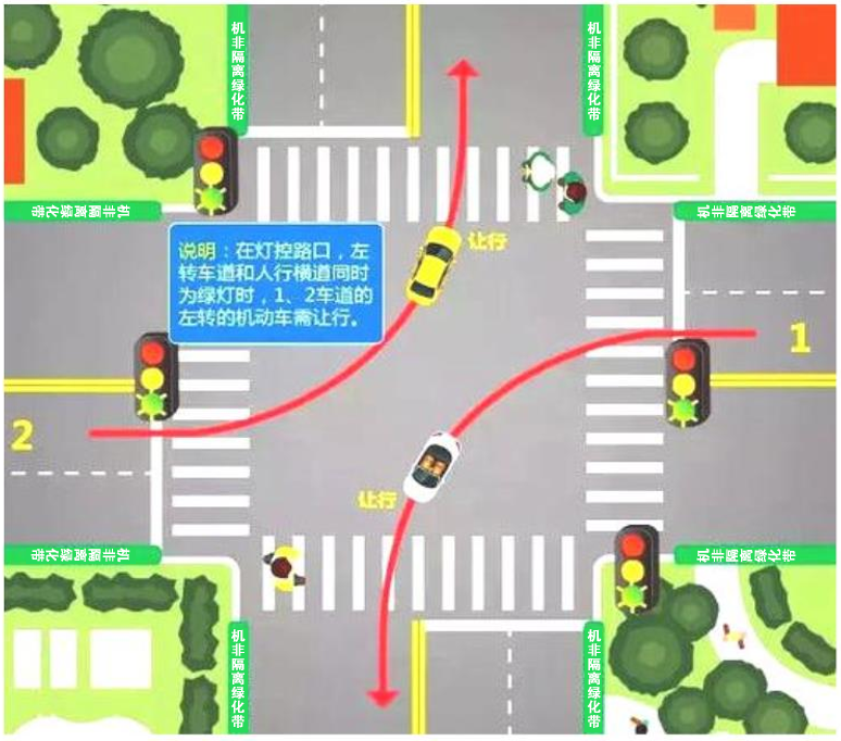 如果機(jī)動(dòng)車道和人行橫道都是綠燈,機(jī)動(dòng)車向左行駛時(shí),一旦發(fā)現(xiàn)有行人通過,應(yīng)該停車讓行。如圖:車道車輛①、②。