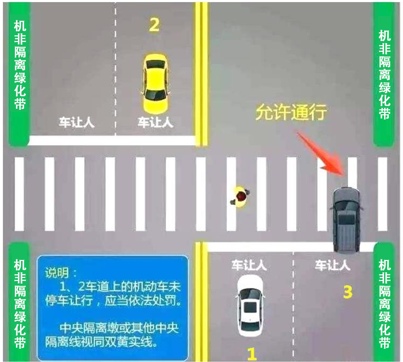 如果行人快走到路中央時(shí),③車道的車輛可以通過,①、②車道的車輛需停車讓行。