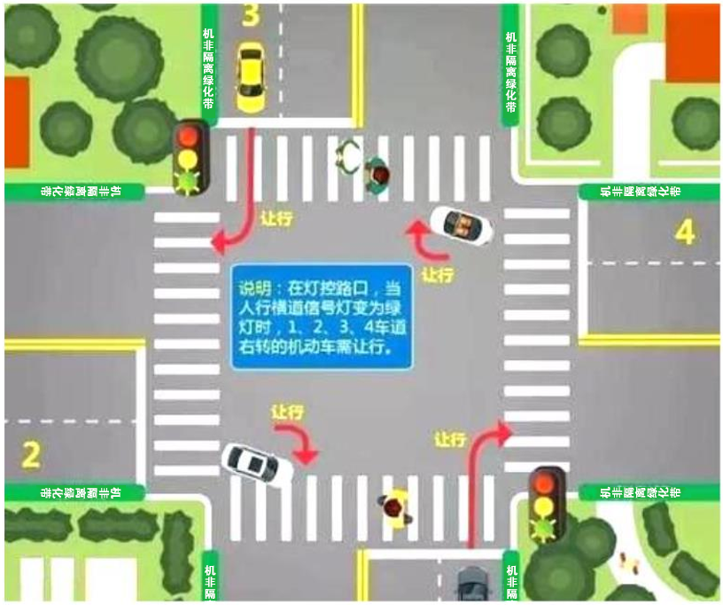 當(dāng)人行橫道信號(hào)燈變?yōu)榫G燈,行人通過時(shí),①、②、③、④車道右轉(zhuǎn)的機(jī)動(dòng)車都需要讓行。