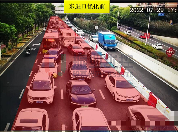 高峰時(shí)段,南進(jìn)口、東進(jìn)口、西進(jìn)口車流量較大,車輛排隊(duì)現(xiàn)象嚴(yán)重,排隊(duì)長(zhǎng)度均在100米以上。