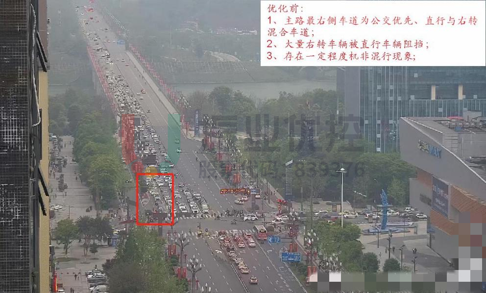 主要擁堵問題體現(xiàn)為晚高峰期間大量車流由經(jīng)開區(qū)、高速路口經(jīng)新壩大橋短時(shí)間集中至該交叉口西進(jìn)口,最長排隊(duì)長度超660米,平均排隊(duì)次數(shù)5-6次,平均延誤時(shí)間超過30分鐘。經(jīng)調(diào)研分析,導(dǎo)致?lián)矶掳l(fā)生的原因主要為如下三方面: