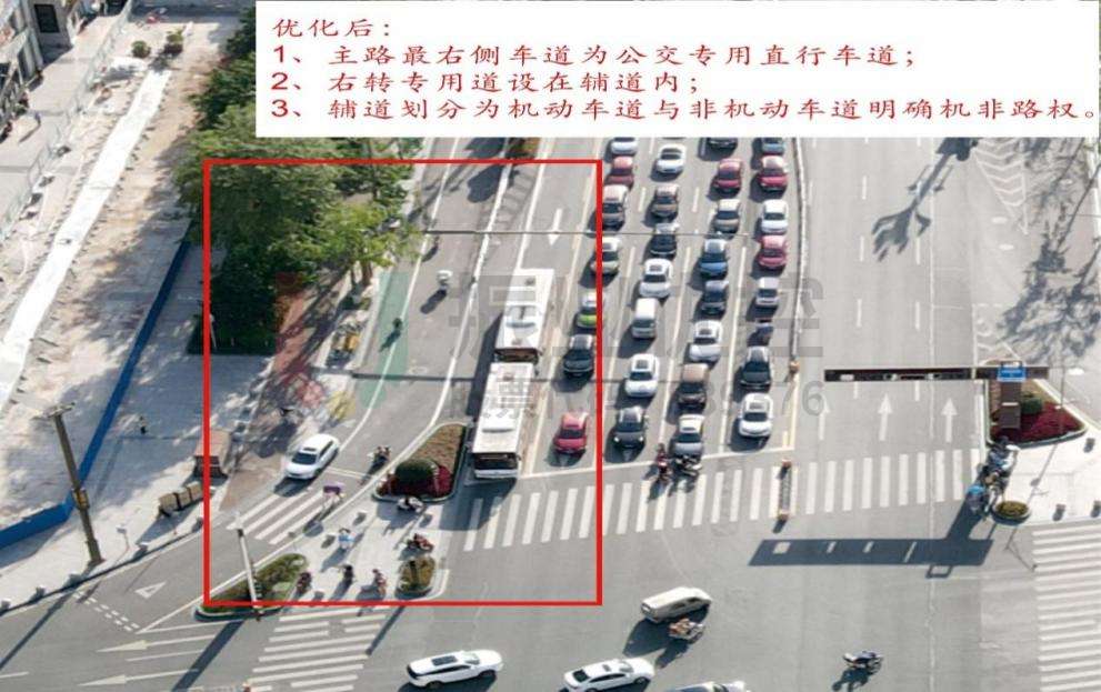 將西進(jìn)口輔道設(shè)置為機(jī)動車與兩三輪車右轉(zhuǎn)通道,通過實(shí)線劃分車道,再將主路最右側(cè)車道改為直行車道,右轉(zhuǎn)前置,促使車輛提前進(jìn)入輔道進(jìn)行右轉(zhuǎn);并偏移南出口道護(hù)欄,增加50厘米行駛空間,使交叉口流向更加統(tǒng)一、順暢。