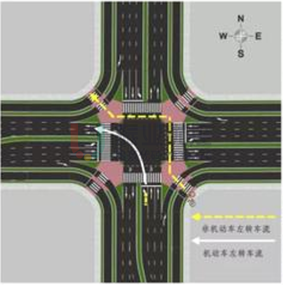 針對左轉(zhuǎn)非機動車較少或機動車通行壓力較大的交叉口,在斑馬線前劃定非機動車通道,非機動車沿斑馬線通行,左轉(zhuǎn)非機動車禁止直接左轉(zhuǎn),需二次通行完成左轉(zhuǎn)。