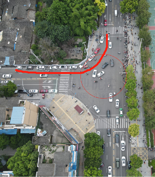 二是江公街(青衣街-江鄉(xiāng)街),是從北側(cè)進入后向南側(cè)左轉(zhuǎn)的一條街,雙向兩車道且為弧形路段,目前為限時單行路段(7:00-19:00)。