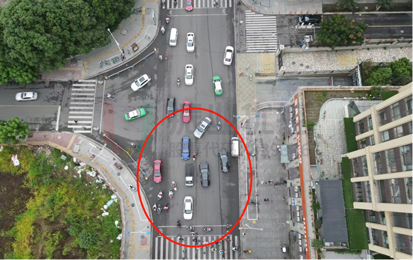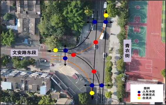 青衣街-文安東路為典型的三岔路口( T型路口),該路口無燈控,存在人車混行,路口秩序混亂,通行效率較低等問題。
