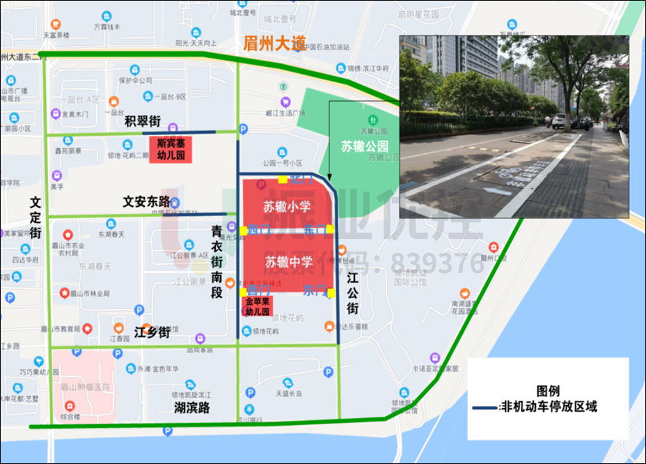 在眉州大道輔道(靠近蘇轍公園側(cè))設(shè)置臨時停車等候區(qū),該區(qū)域步行至小學(xué)約5分鐘。通過規(guī)劃臨停區(qū),減少200臺私家車駛?cè)肭嘁陆趾徒郑徑庵苓吢肪W(wǎng)交通壓力。
