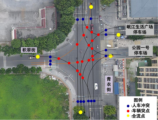 青衣街-積翠街為五岔畸形路口且無燈控,路口內(nèi)部人車沖突非常嚴(yán)重;東側(cè)有兩個停車場出入口,其中,公園一號早高峰期間有320輛次駛出,對路口通行干擾較大;下午放學(xué)時段,路邊商販占道經(jīng)營,也容易擾亂路口交通秩序;同時,該路口距上游眉州大道-青衣街信號燈路口不足200m,雨天及惡劣天氣極易出現(xiàn)回溢。