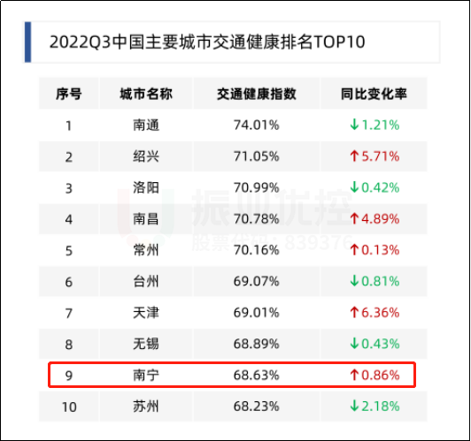 根據(jù)互聯(lián)網(wǎng)平臺數(shù)據(jù),南寧市入選2022年第三季度中國主要城市交通健康排名TOP10,健康指數(shù)同比上升0.86%。