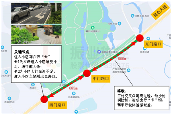 對路口交通問題進行精準研判,針對小區(qū)進出口通行能力短板問題開展重點改造,解決路口通行能力失衡引發(fā)的擁堵問題,結(jié)合協(xié)調(diào)控制方案,由點到線提升主干道車流的通行效率。