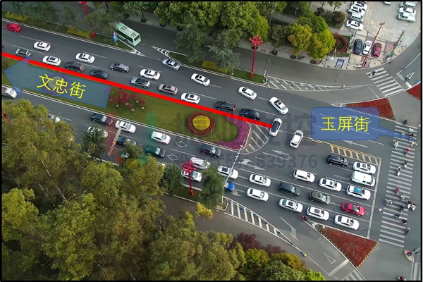 3.交叉口東、西、南、北向均存在占道施工情況,大大降低交叉口通行效率。其中,西進(jìn)口直行擁堵尤為嚴(yán)重,車輛排隊(duì)長度達(dá)700米,并回溢至下游文忠街-玉屏街交叉口。