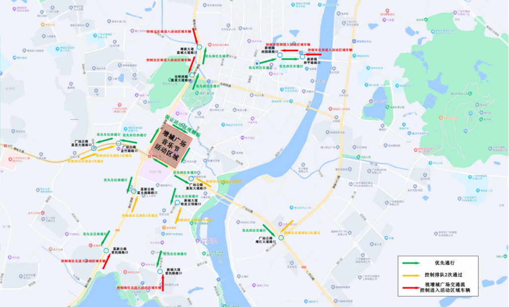 活動前,考慮到活動會場位于增城區(qū)最繁華的商圈內(nèi)部,增城交警大隊(duì)與增城配時(shí)中心多次前往現(xiàn)場實(shí)地調(diào)研。針對會場周邊廣汕公路、荔新公路等6條重要路段車流走向開展研判,確定了“外截內(nèi)疏、緩進(jìn)快出”的信控保障策略,即核心區(qū)域(會場)快速疏散、外圍區(qū)域(廣汕公路、荔新公路、府佑路、荔景大道等)控流緩進(jìn);并根據(jù)停車場對會場周邊交通的影響程度、會場與停車場之間步行距離等因素,確定了11個(gè)停車點(diǎn)。