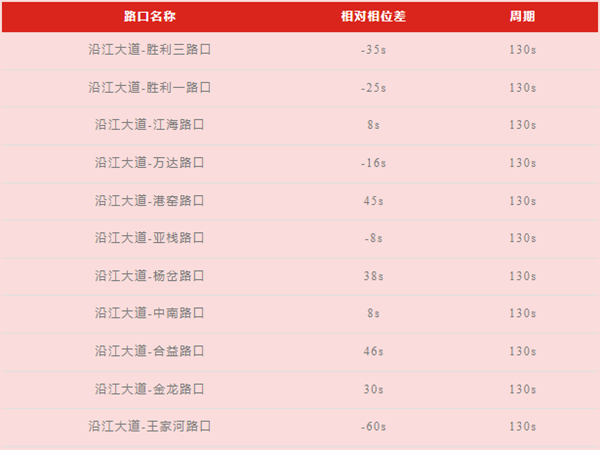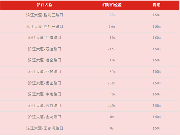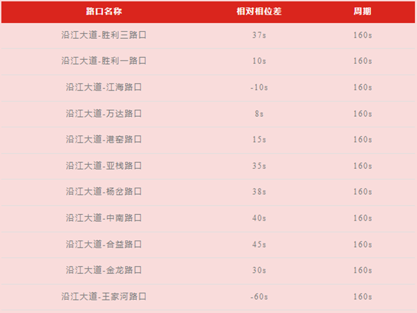 為提升路段通行效率,結(jié)合道路條件良好的情況(雙向六車道、直行對放綠信比高、道路呈東西直行、弧度小視野良好),分早高峰、平峰、晚高峰對沿江大道進(jìn)行綠波協(xié)調(diào)。