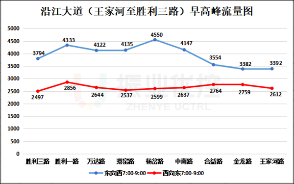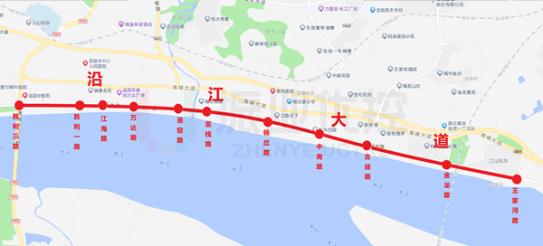 沿江大道是宜昌市東西向的城市主干道,雙向六車道,長6.4公里,分布有11個T形路口,其中港窯路至勝利一路段路口間距短,平均間距僅350米。