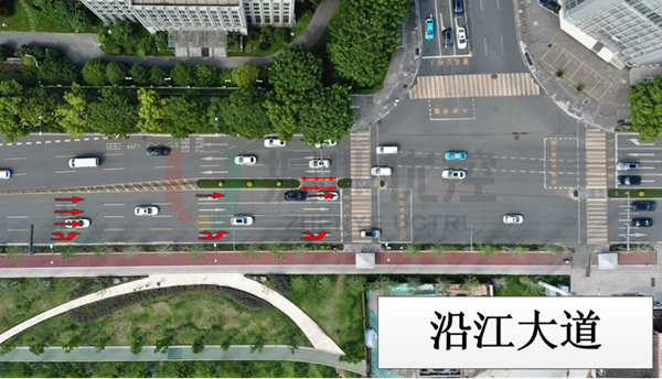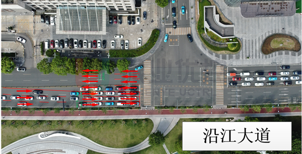 1.沿江大道-萬達(dá)路口擁堵情況大幅緩解,東進(jìn)口直行車輛與北進(jìn)口右轉(zhuǎn)車輛各行其道,爭搶車道的情況基本消除,未出現(xiàn)車流回溢現(xiàn)象。