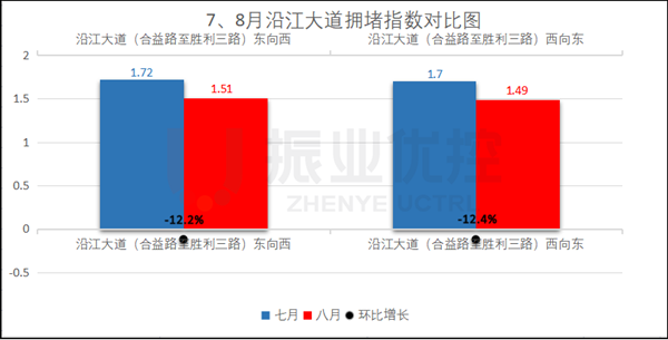 3.沿江大道擁堵指數(shù)顯著下降。環(huán)比7月沿江大道東向西進(jìn)城方向擁堵指數(shù)下降12.2%;西向東出城方向擁堵指數(shù)下降12.4%,達(dá)到了擁而不堵、快速通過、有序通行的效果。