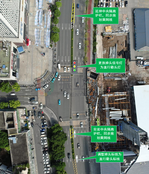 (2)清除沿江大道-江海路口雙向掉頭箭頭,改為直行箭頭,并同步更換路口車道標(biāo)識牌與信號燈。