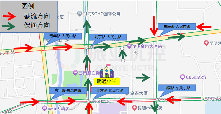 針對該學(xué)校特殊的地理位置,配時(shí)中心結(jié)合學(xué)生上學(xué)時(shí)間,提前預(yù)測堵點(diǎn),制定出“遠(yuǎn)端截流+近端疏散”的保障方案。以學(xué)校為中心,保障北京路-人民東路、北京路-東風(fēng)東路兩個(gè)路口南北向,白塔路-人民東路東西向的順暢通行,對青年路、白塔路匯流方向進(jìn)行截流。