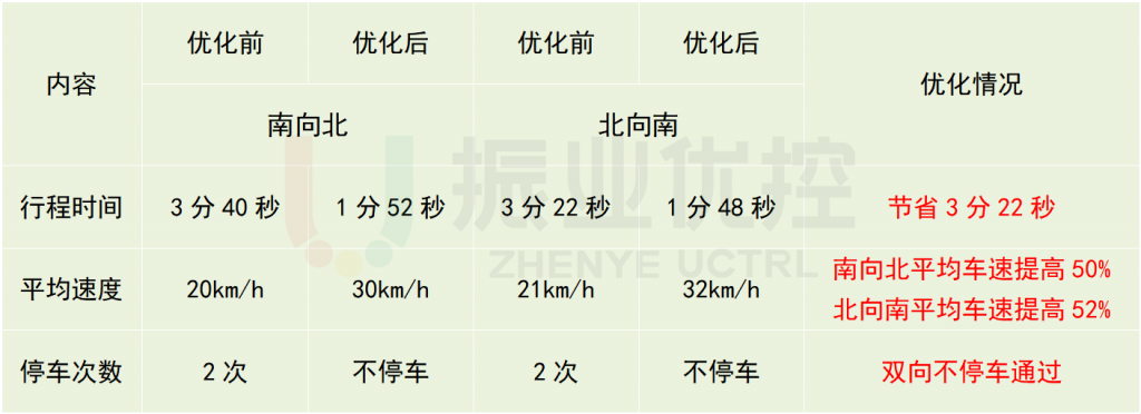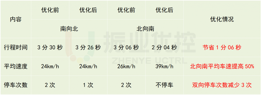 詩書路北段優(yōu)化前雙向停車4次,優(yōu)化后可雙向不停車通過,優(yōu)化率100%;車輛平均行駛速度由21km/h提升至31km/h,優(yōu)化率48%。