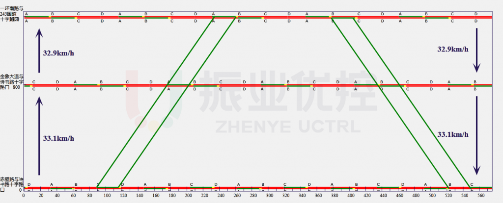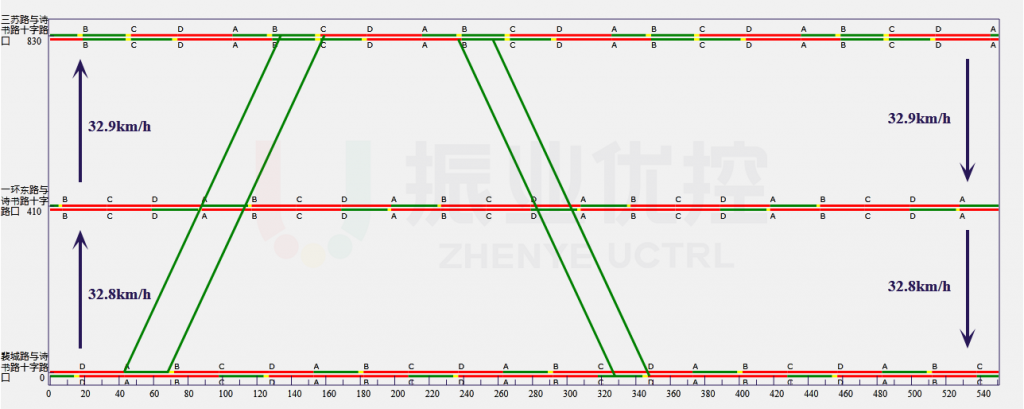 2.經(jīng)過分析計(jì)算,詩書路北段(裴城路至紅星西路)協(xié)調(diào)周期110秒,南段(環(huán)湖路至一環(huán)南路)協(xié)調(diào)周期115秒,均采用小周期控制,以下為綠波協(xié)調(diào)時距圖。