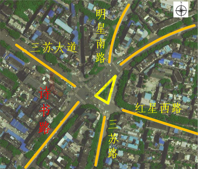 詩書路中段的鐘樓路口為七岔路口,與三蘇大道、三蘇路、紅星西路等道路相交,路口總體車流量較大。另外,由于路口地理位置特殊且交通組織條件復(fù)雜,配時優(yōu)化空間較小,難以同時與上下游路口進(jìn)行雙向綠波控制。