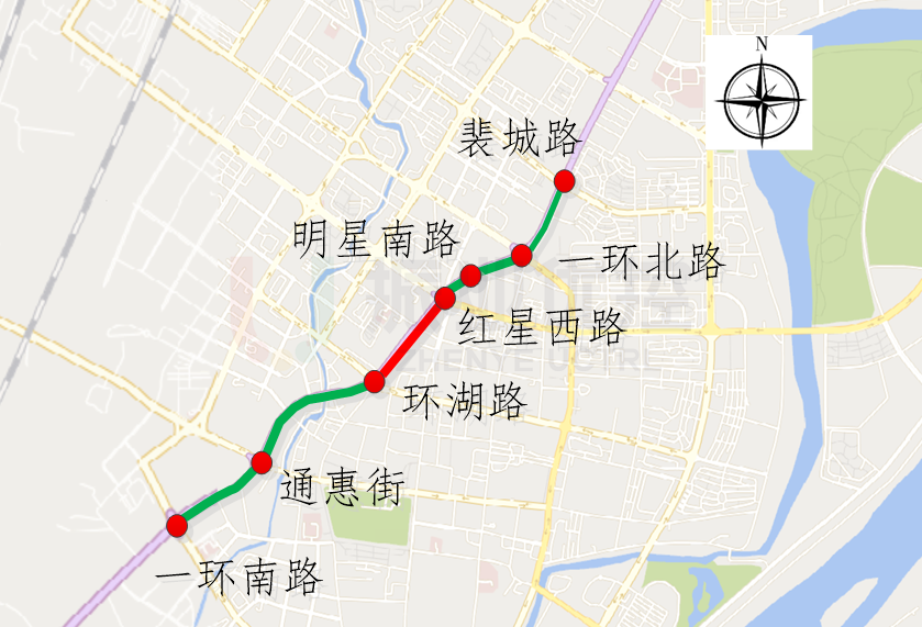 詩書路沿線路口未進(jìn)行綠波協(xié)調(diào)控制,北段(裴城路至紅星西路)雙向平均行程時間7分鐘,平均停車次數(shù)4次;南段(環(huán)湖路至一環(huán)南路)雙向平均行程時間8分鐘,平均停車次數(shù)4次;行車延誤高、通行體驗(yàn)較差。