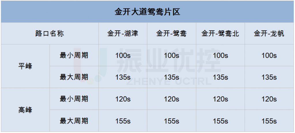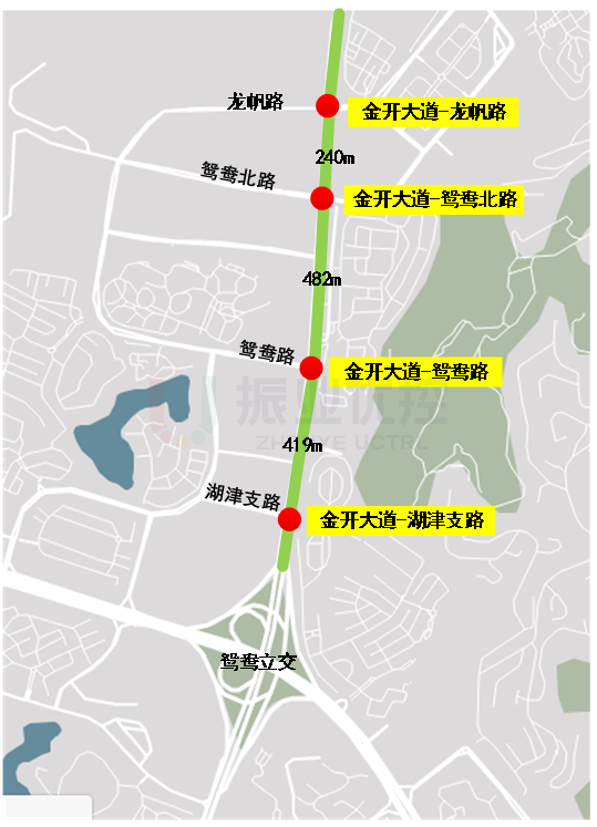 該路段全長1.1km,雙向6車道,沿線分布金開大道-湖津支路、金開大道-鴛鴦路、金開大道-鴛鴦北路、金開大道-龍帆路4個信控路口,并均已實現(xiàn)聯(lián)網(wǎng)控制。