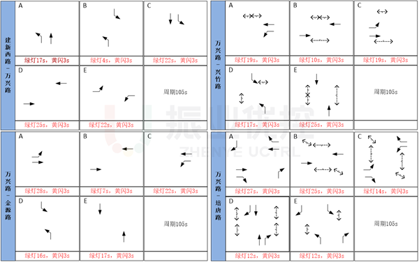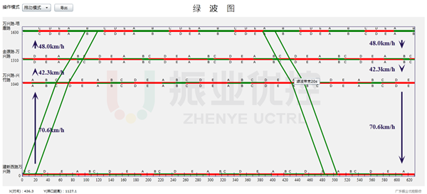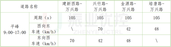 4.設(shè)計雙向綠波協(xié)調(diào)方案。平峰時段(9:00-17:00),對萬興路(培唐路-建新西路)實施雙向“變速”綠波協(xié)調(diào)控制。協(xié)調(diào)路段上下行綠波帶寬均為20秒。