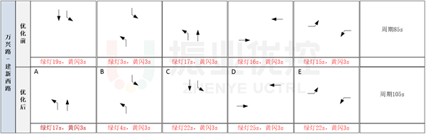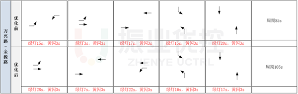 優(yōu)化路口相位相序。對萬興路-建新西路、萬興路-金源路兩個路口的相位相序進行調(diào)整,保證單個路口正常運行的情況下,提高路段協(xié)調(diào)控制效果。