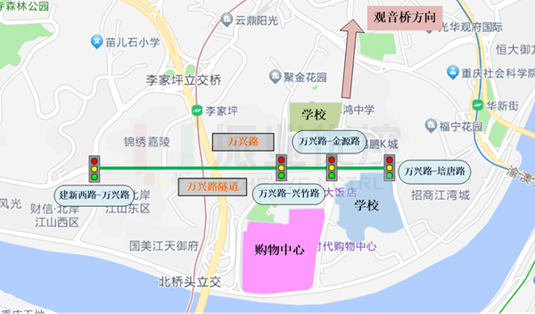萬興路位于重慶市江北區(qū),全長約2.2公里,東向連接華福路,西向連接建新西路,是渝澳片區(qū)東西走向的主要通道。周邊分布有居民小區(qū)、學(xué)校、酒店、購物中心等交通吸引點,日常交通通行需求較大。