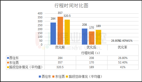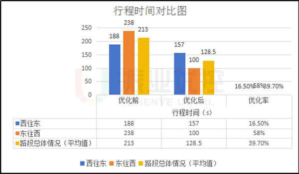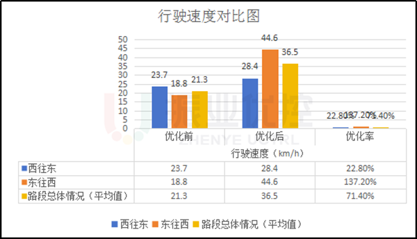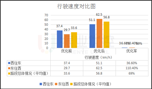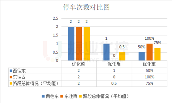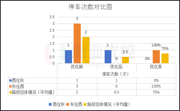 西段平均行程時間由213s減少至128.5s,優(yōu)化率為39.7%;平均行駛速度由21.3km/h提升至36.5km/h,優(yōu)化率為71.4%;平均停車次數(shù)由2次減少至0.5次,優(yōu)化率為75%。