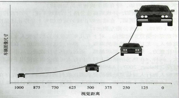 而基于視覺的生物特性,因為視覺距離和車輛圖像大小之間的關(guān)系并非線性關(guān)系,從而增加了道路使用者估算速度的難度,特別是當(dāng)車輛所占視角的變化速率小于0.2度/秒時,觀察者無法檢測到圖像大小在變化(如圖1)。