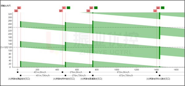 針對路段沿線信號燈設置過多、路口間距較近、路口實際通行需求差異大、行車速度不穩(wěn)定等問題,可以通過分析路段歷史車流數(shù)據(jù)和出行特征,精確定位關鍵路口,并通過相位相序調整、配時精細化管理來控制車流通行速度,減少路口停車次數(shù),實現(xiàn)不同時間段的行駛效果。
