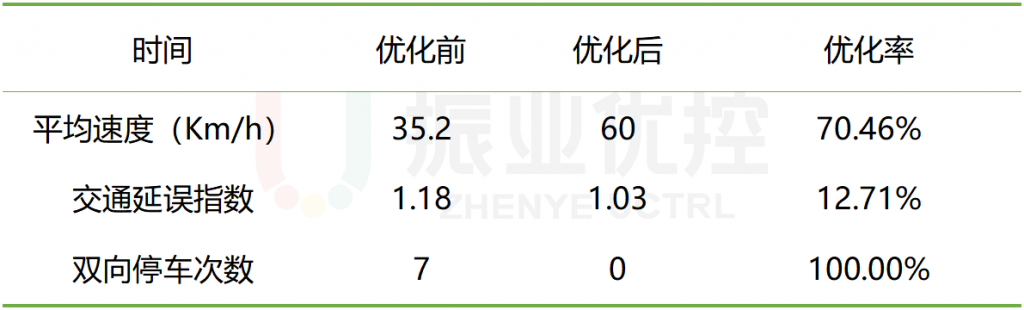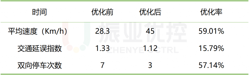 平峰時段,路段停車次數(shù)由7次減少至0次,路口延誤指數(shù)由1.18下降至1.03,平均行駛速度由35.2km/h提升至60km/h,優(yōu)化率達70.46%。