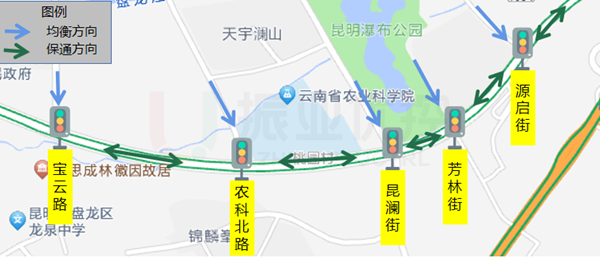 本次優(yōu)化綜合考慮道路通行條件與車流量等因素,針對北京路(寶云路-源起街)沿線各路口間距過短、車流量較大、停車次數(shù)多的問題。