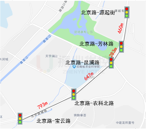 北京路延長線寶云路至源起街,全程2.2公里,總涉及5個路口。周邊分布新建住宅區(qū)、觀景區(qū)和辦公區(qū),隨著住宅區(qū)入住率大幅上升,私家車數(shù)量明顯增加,路段通行壓力增大。