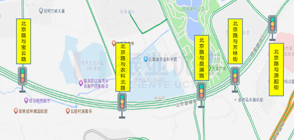 北京路(寶云路-源起街)路段長2.2公里,沿線共設置了5個信號燈路口,最短間距僅283米,易導致車流溢出至下游路口。