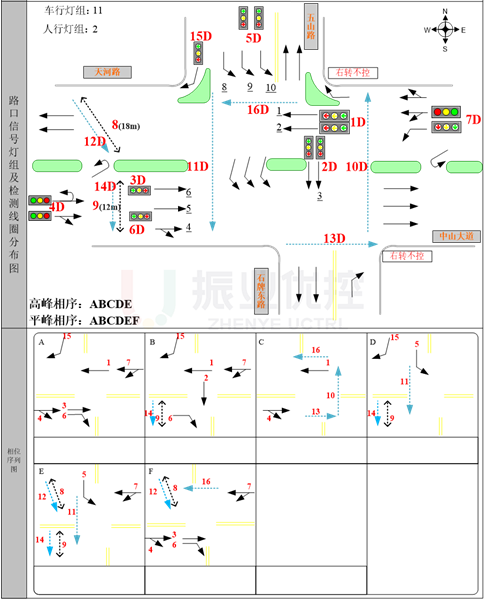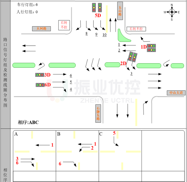 按路口渠化改造情況,原信控方案三相位調(diào)整為六相位??紤]到路口增設(shè)非機(jī)動車及行人過街后,方案相位變化較大、各進(jìn)口等待時間增加等情況,非機(jī)動車采取一次過街設(shè)計,行人過街采取二次過街設(shè)計。
