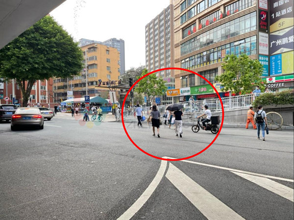 因路口日常非機(jī)動車與行人的流量較大,設(shè)置了過街天橋,但過街天橋使用率較低。路口西側(cè)行人橫穿馬路、非機(jī)動車穿行情況頻發(fā),與機(jī)動車互相干擾,險象環(huán)生,存在較大的安全隱患。