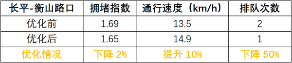 調(diào)整后,北進(jìn)口左轉(zhuǎn)通行能力提升66%,直行下降9%;路口整體通行效率提升28.5%。
