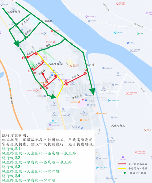 繞行線路4: 鳳凰路北段→學(xué)府街→濱江路。
