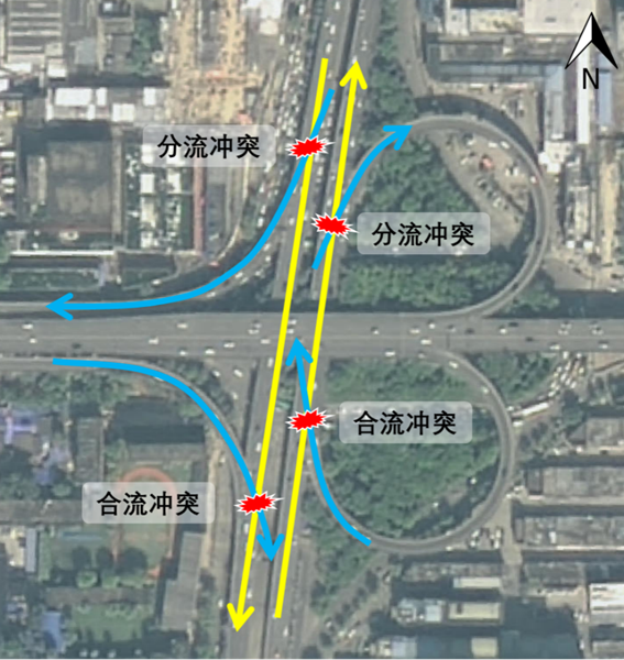 中山東路下匝道與主路分流沖突明顯,機(jī)動(dòng)車之間搶行現(xiàn)象嚴(yán)重,經(jīng)常出現(xiàn)交通事故,進(jìn)而影響路段整體通行效率。