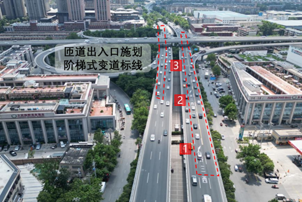 優(yōu)化措施:應(yīng)用階梯式變道交通組織模式。施劃地面文字標(biāo)識(shí)、增設(shè)車道級(jí)指路標(biāo)志,加強(qiáng)引導(dǎo)需駛離車輛在駛出匝道上游提前變道;施劃虛實(shí)線,用于駛離車輛向右變道合流;施劃長(zhǎng)實(shí)線,規(guī)范匝道口行車秩序,防止車輛隨意變道引發(fā)交通事故;增設(shè)電子抓拍警告設(shè)備,對(duì)不按規(guī)定車道行駛等違法行為進(jìn)行短信警示教育,讓車流由無(wú)序變?yōu)橛行颉?/p>
